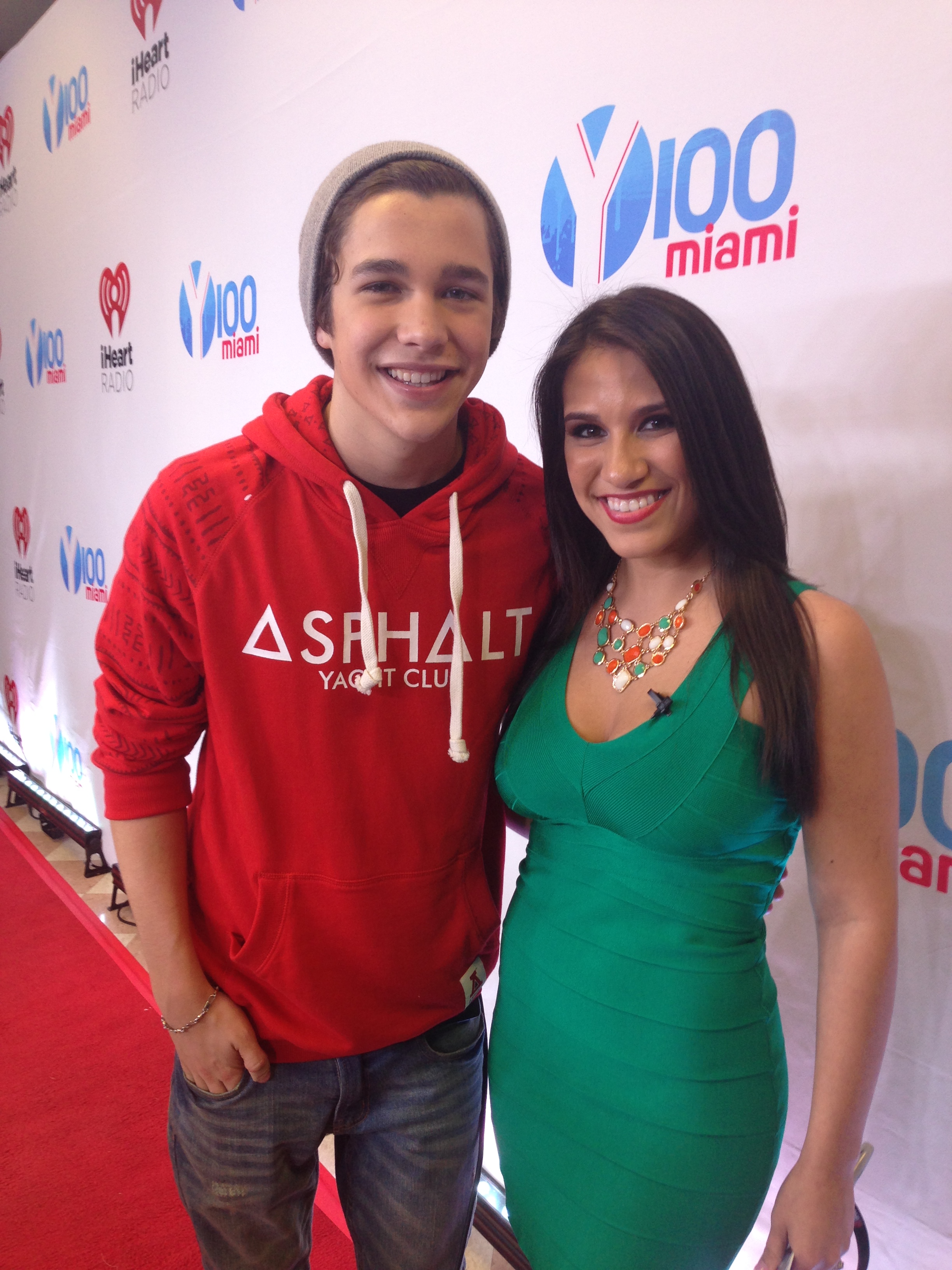 Austin Mahone has some SERIOUSLY dedicated fans. I was going to hold off on posting this interview, but I just couldn’t wait anymore. Austin is finishing off a great year of touring and award shows, including taking home the 2013 VMA for MTV’s Artist to Watch. I’m happy he found time in his busy schedule to swing by the red carpet at Y100’s Jingle Ball to chat with me for a minute. Plus, I got the approval from him on my dress 😉